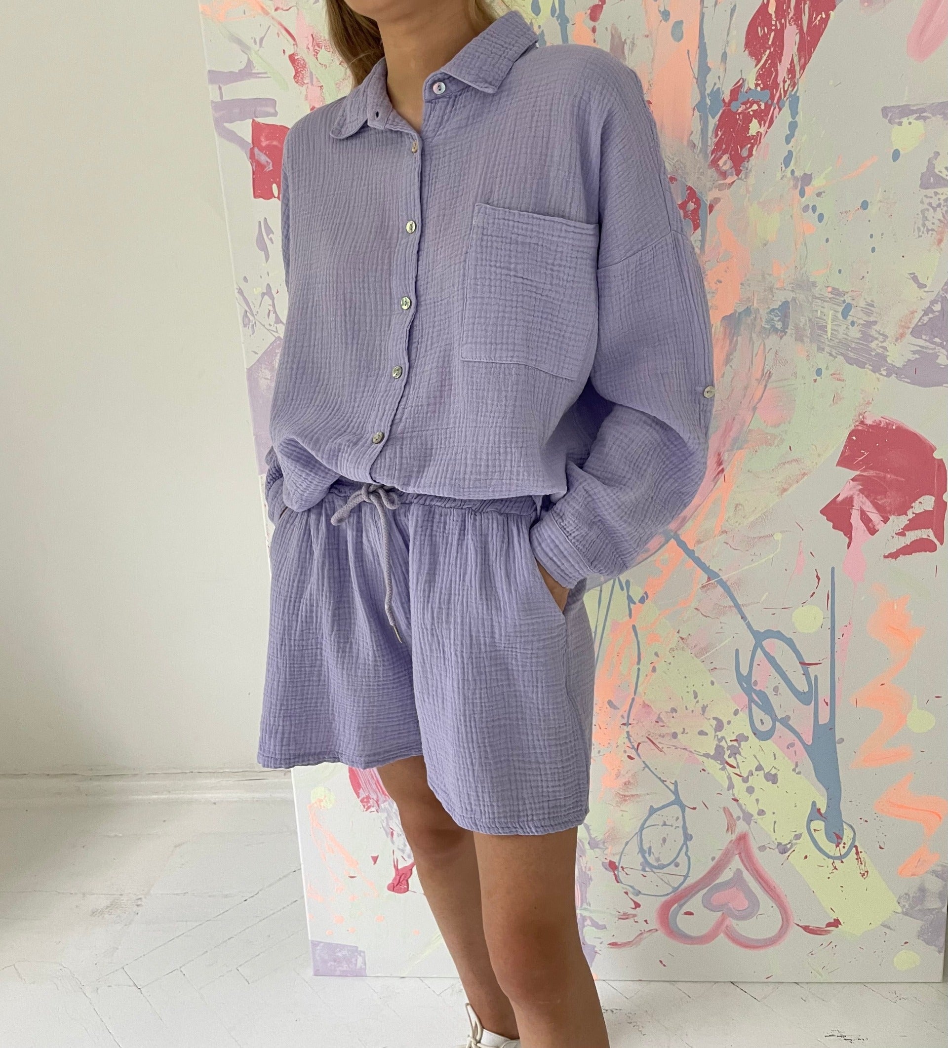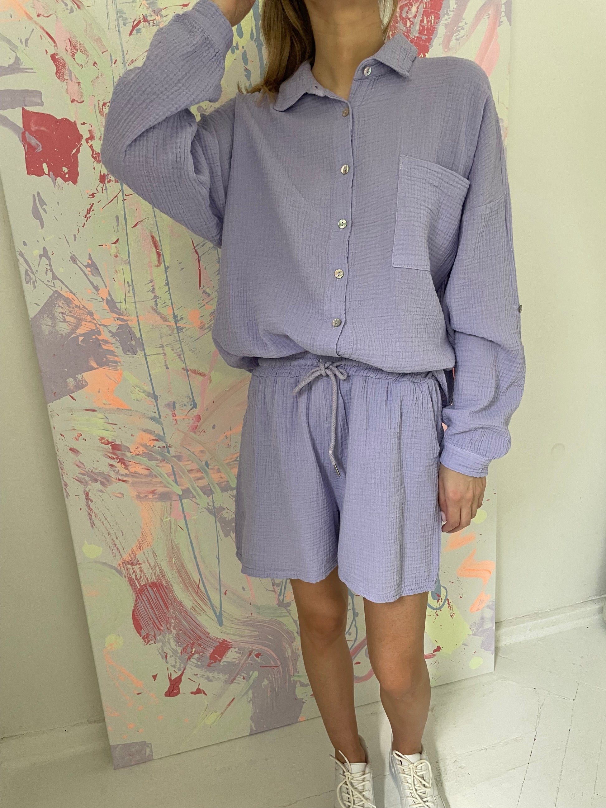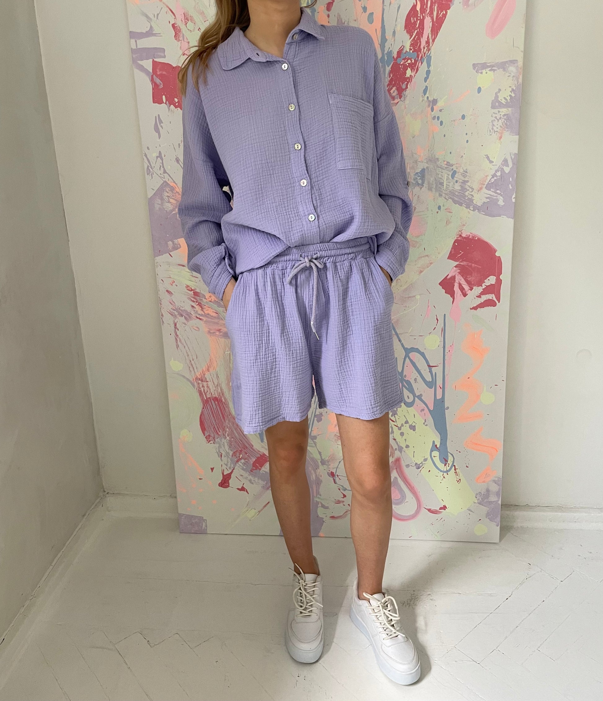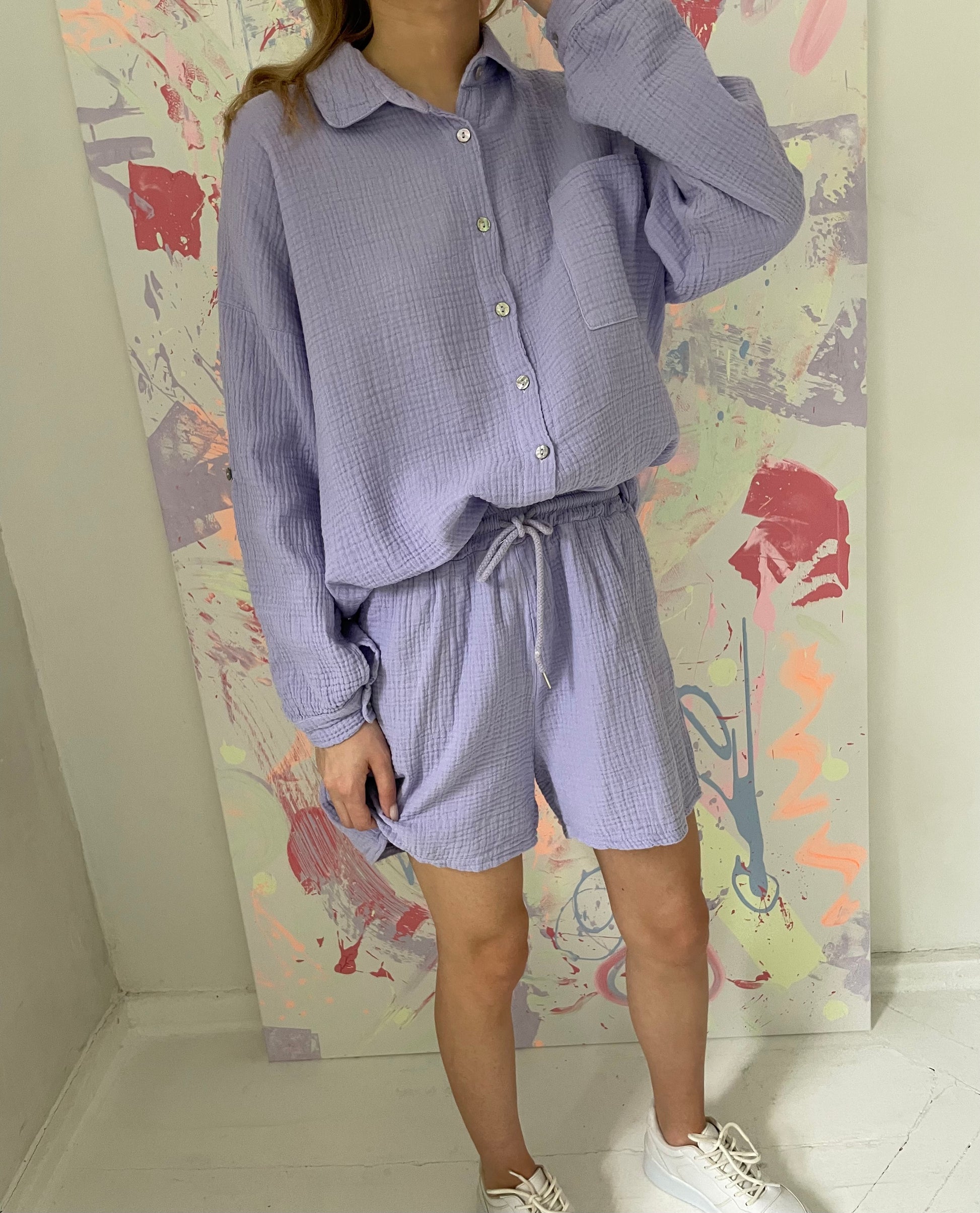 - Dydis universalus, šortų ilgis 42cm, juosmuo su guma, tempiasi iki 42*2cm. Marškinių ilgis priekyje 77cm, nugaroje 83cm. Rankovės ilgos arba susisega.