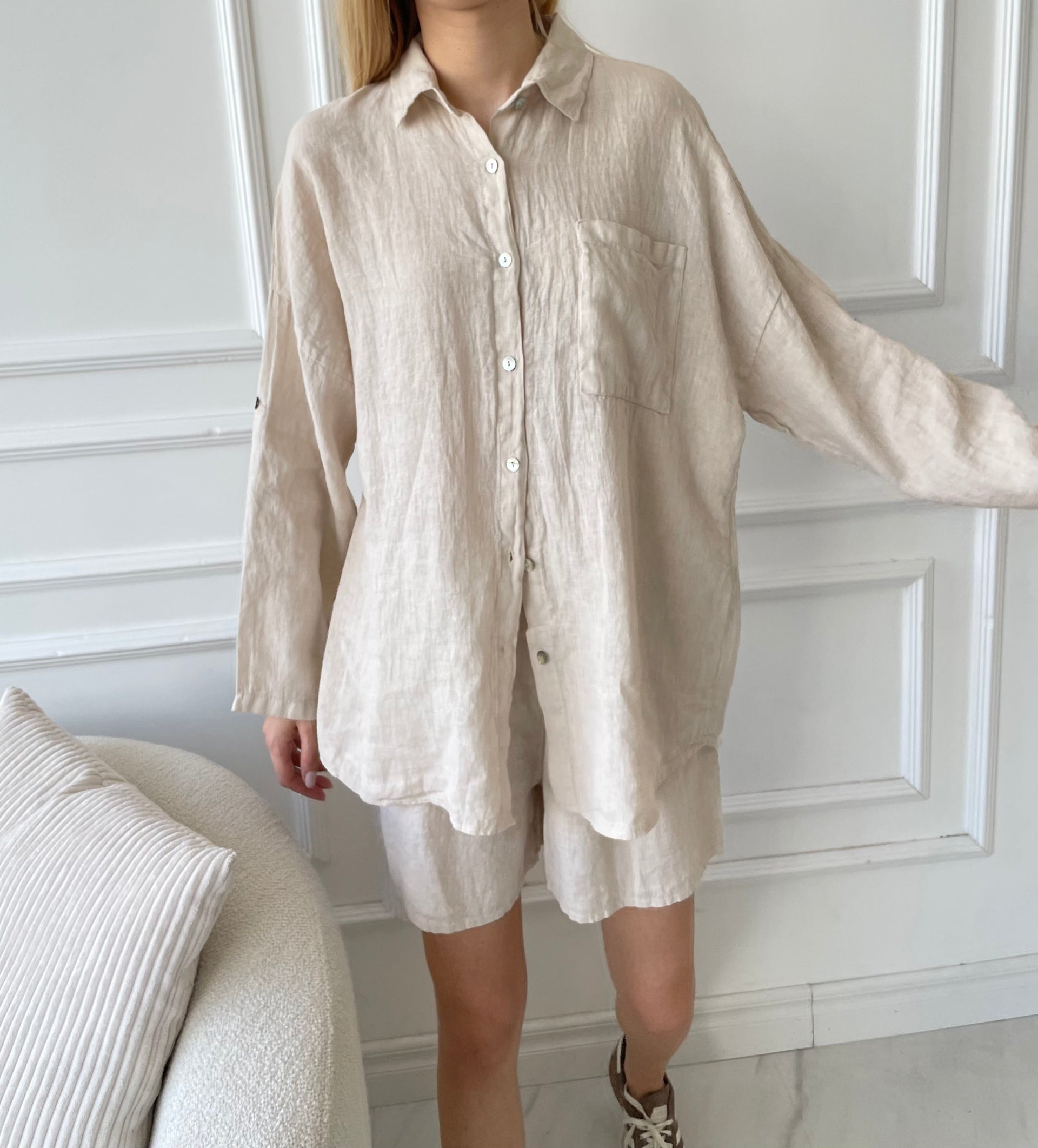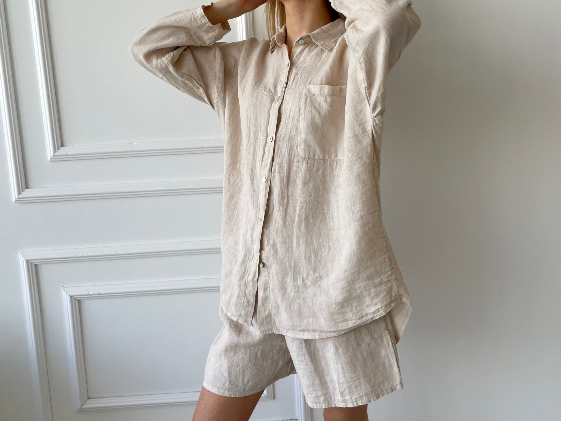 Beige lino kostiumas su šortais
