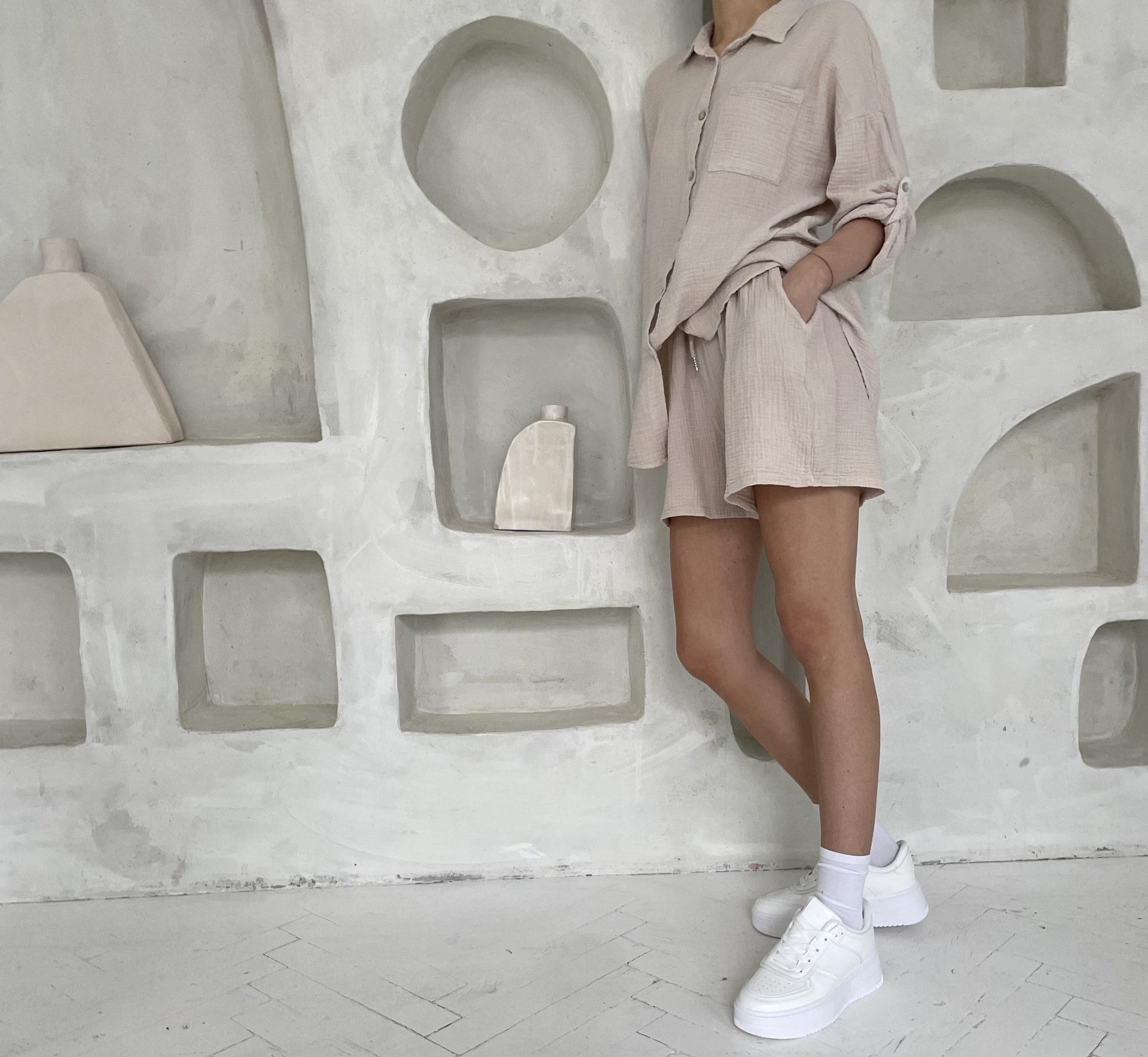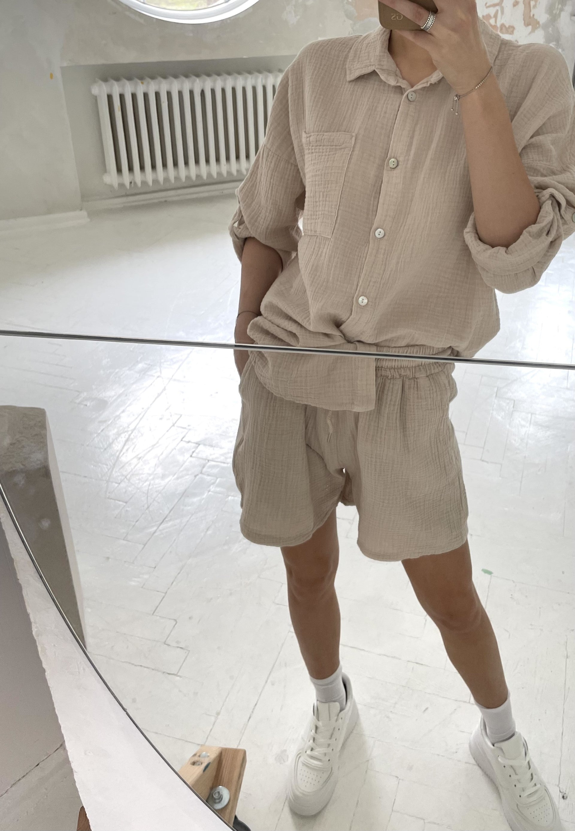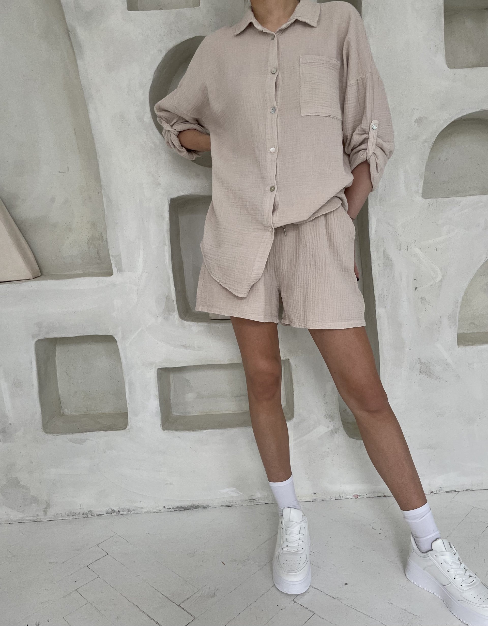 - Dydis universalus, šortų ilgis 42cm, juosmuo su guma, tempiasi iki 42*2cm. Marškinių ilgis priekyje 77cm, nugaroje - 83cm. Rankovės ilgos ir susisega.