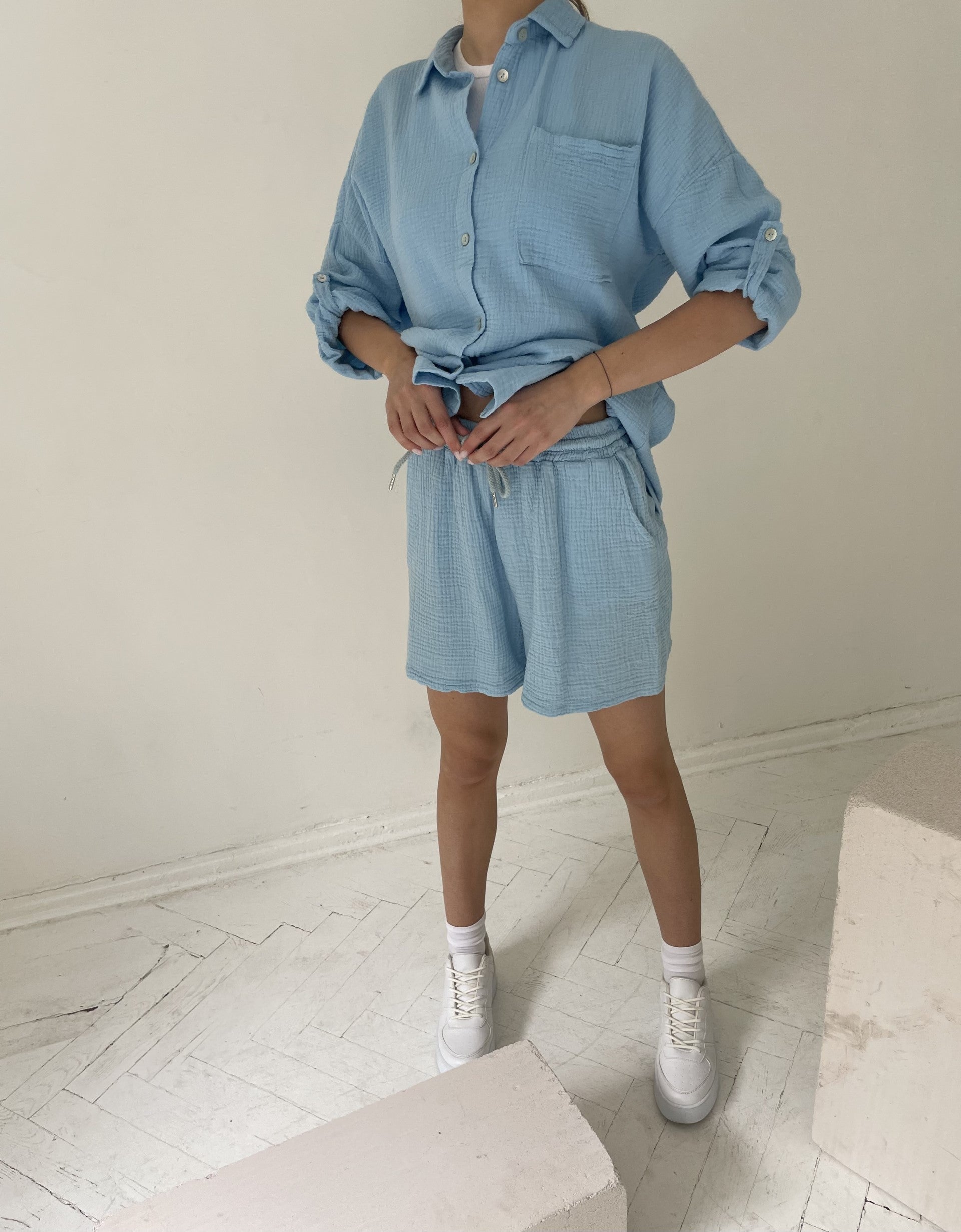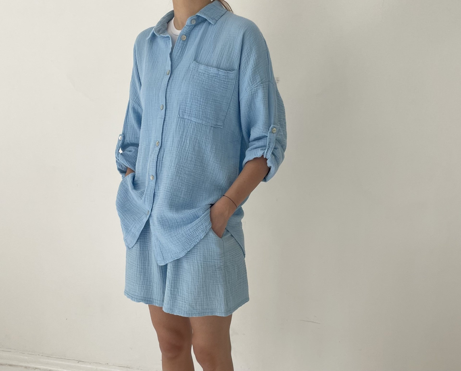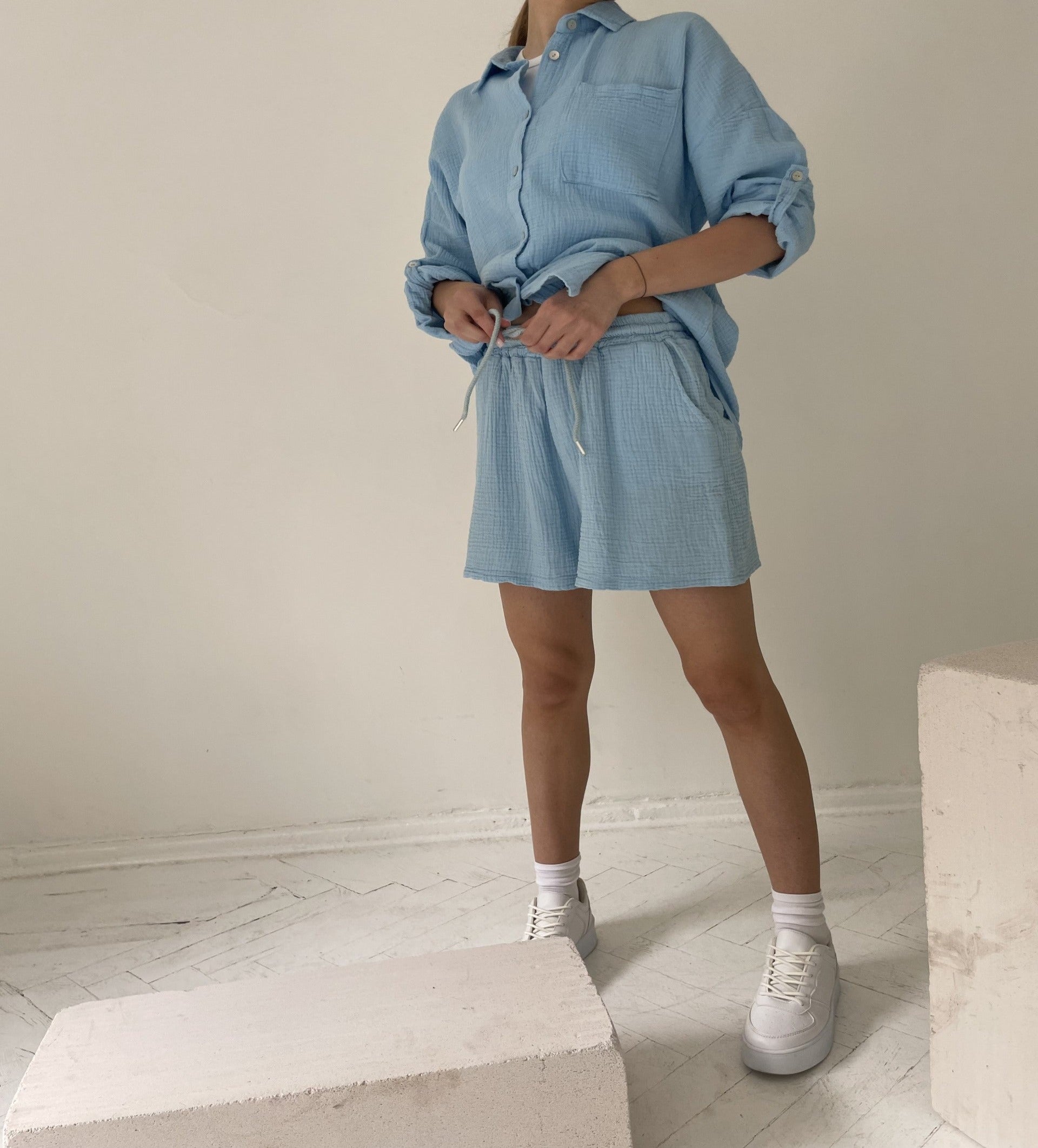 - Dydis universalus, šortų ilgis 42cm, juosmuo su guma, tempiasi iki 42*2cm. Marškinių ilgis priekyje 77cm, nugaroje - 83cm. Rankovės ilgos ir susisega.
