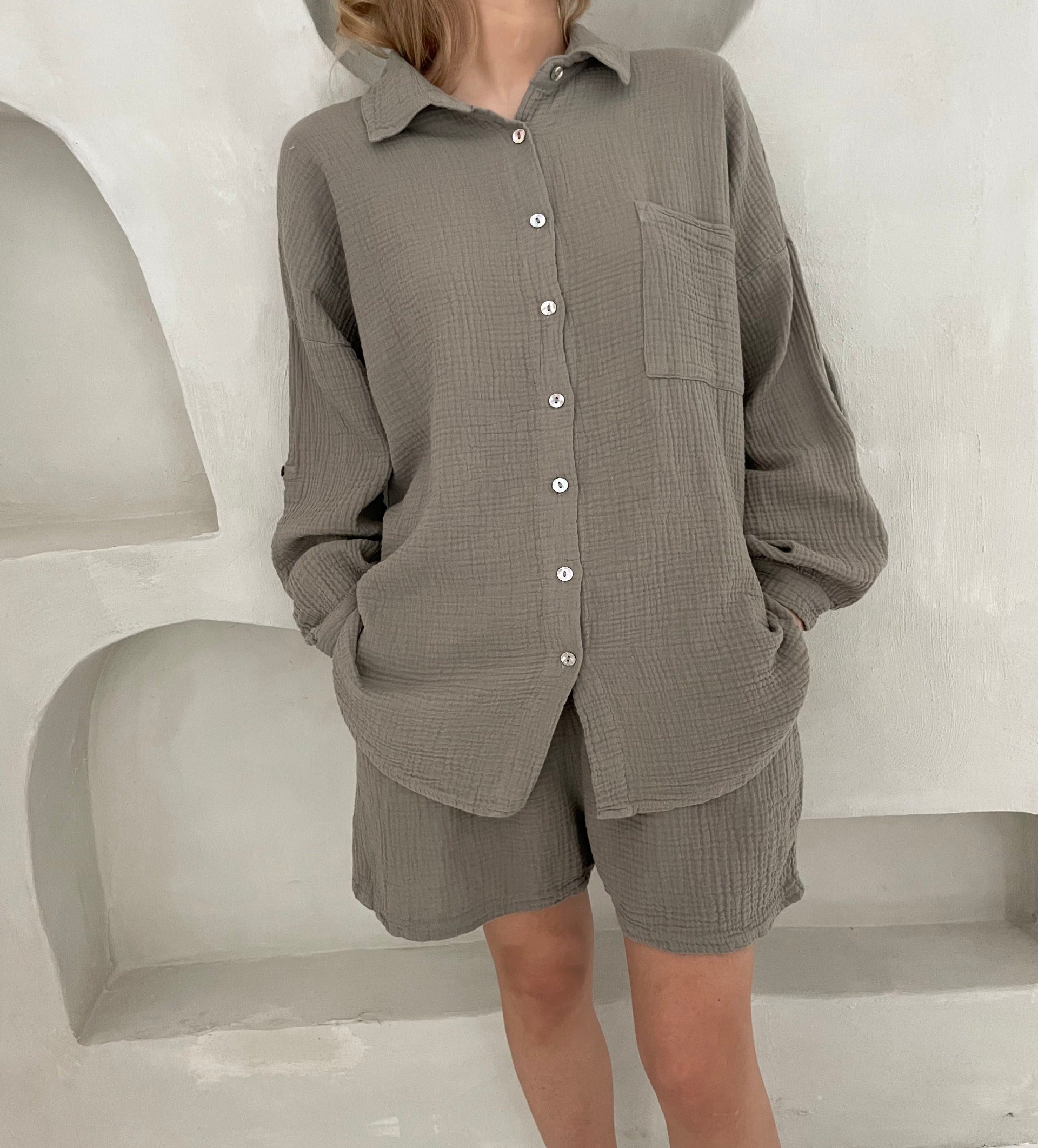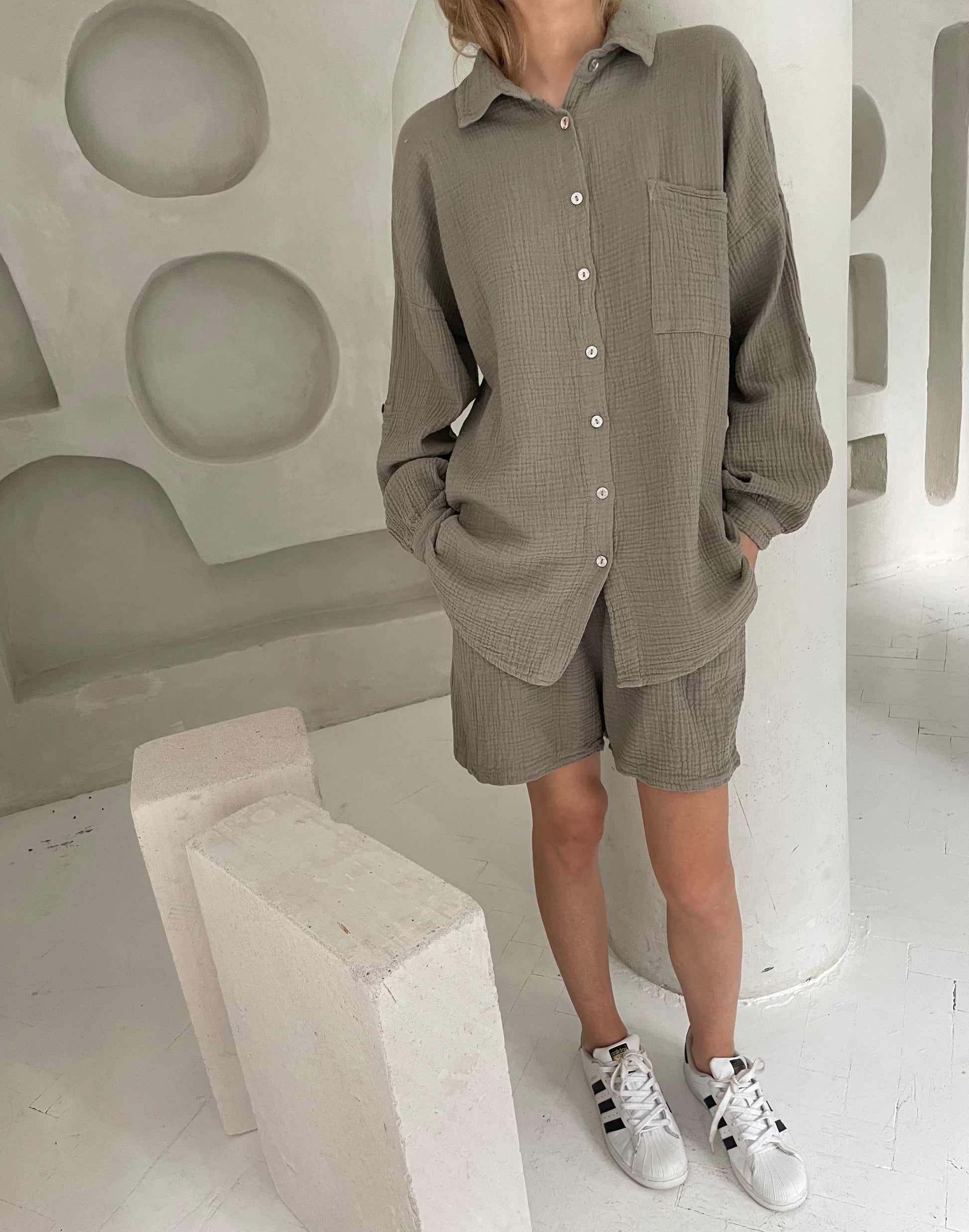 - Dydis universalus, šortų ilgis 42cm, juosmuo su guma, tempiasi iki 42*2cm. Marškinių ilgis priekyje 77cm, nugaroje - 83cm. Rankovės ilgos ir susisega.