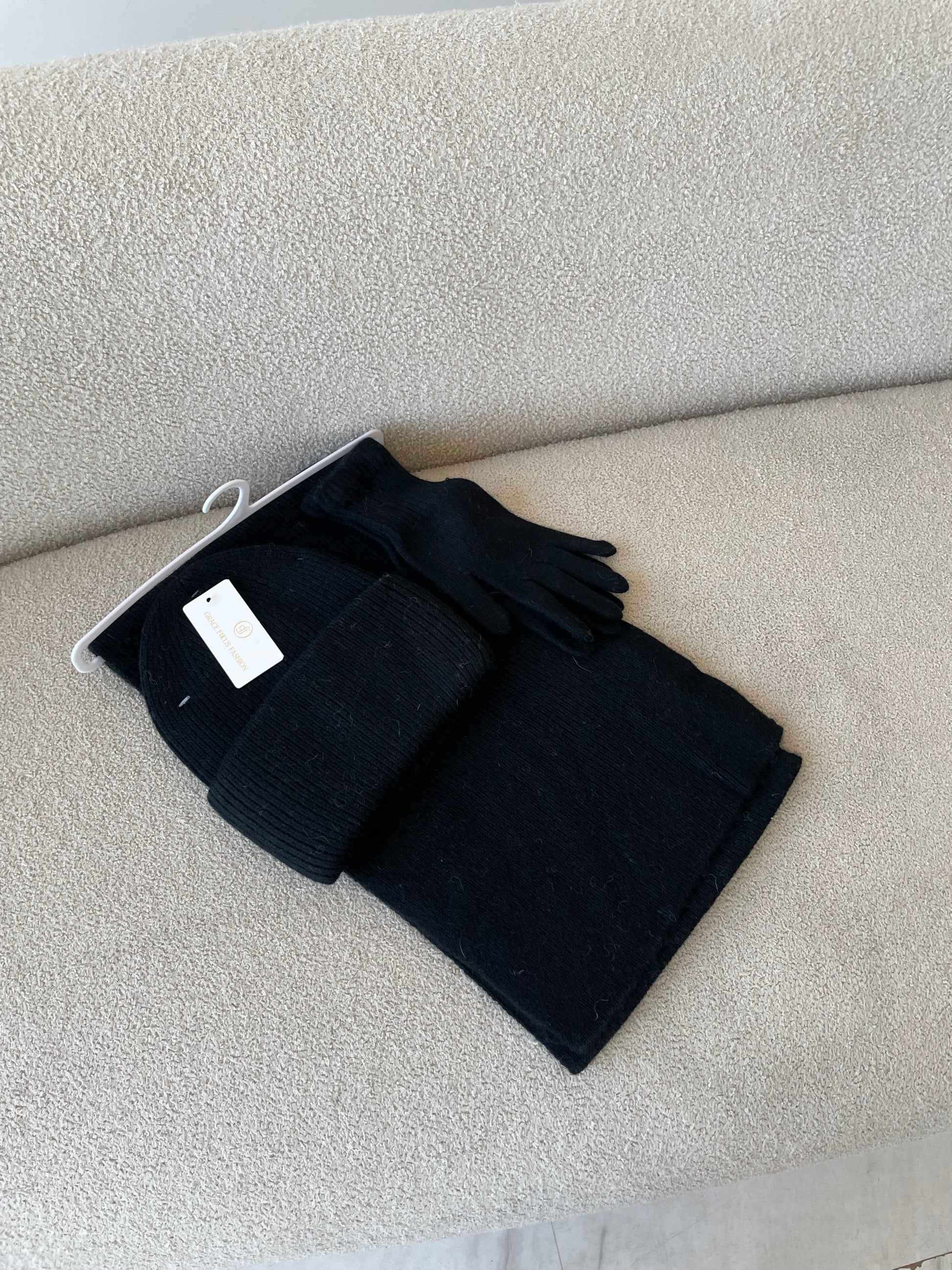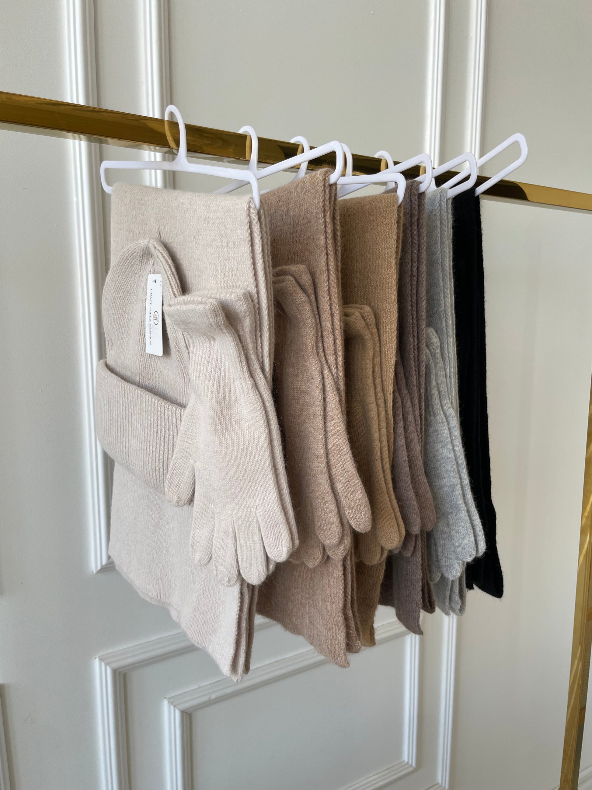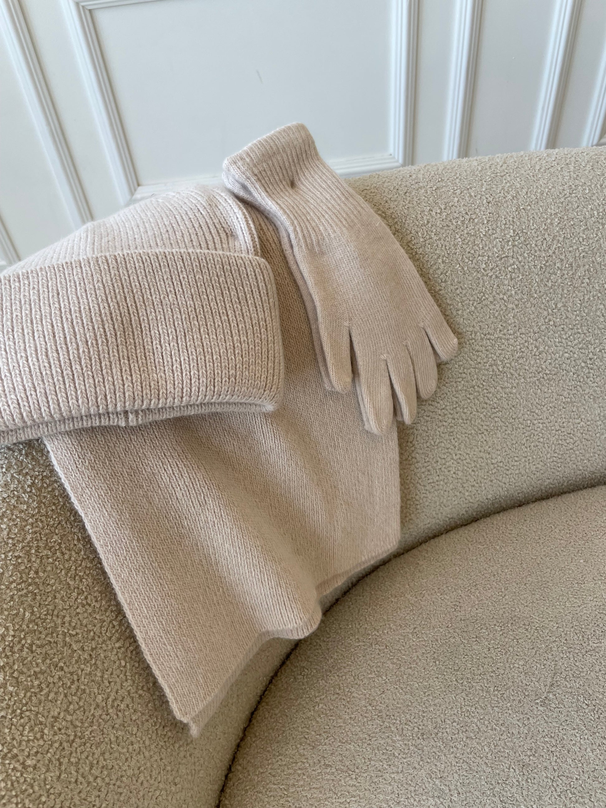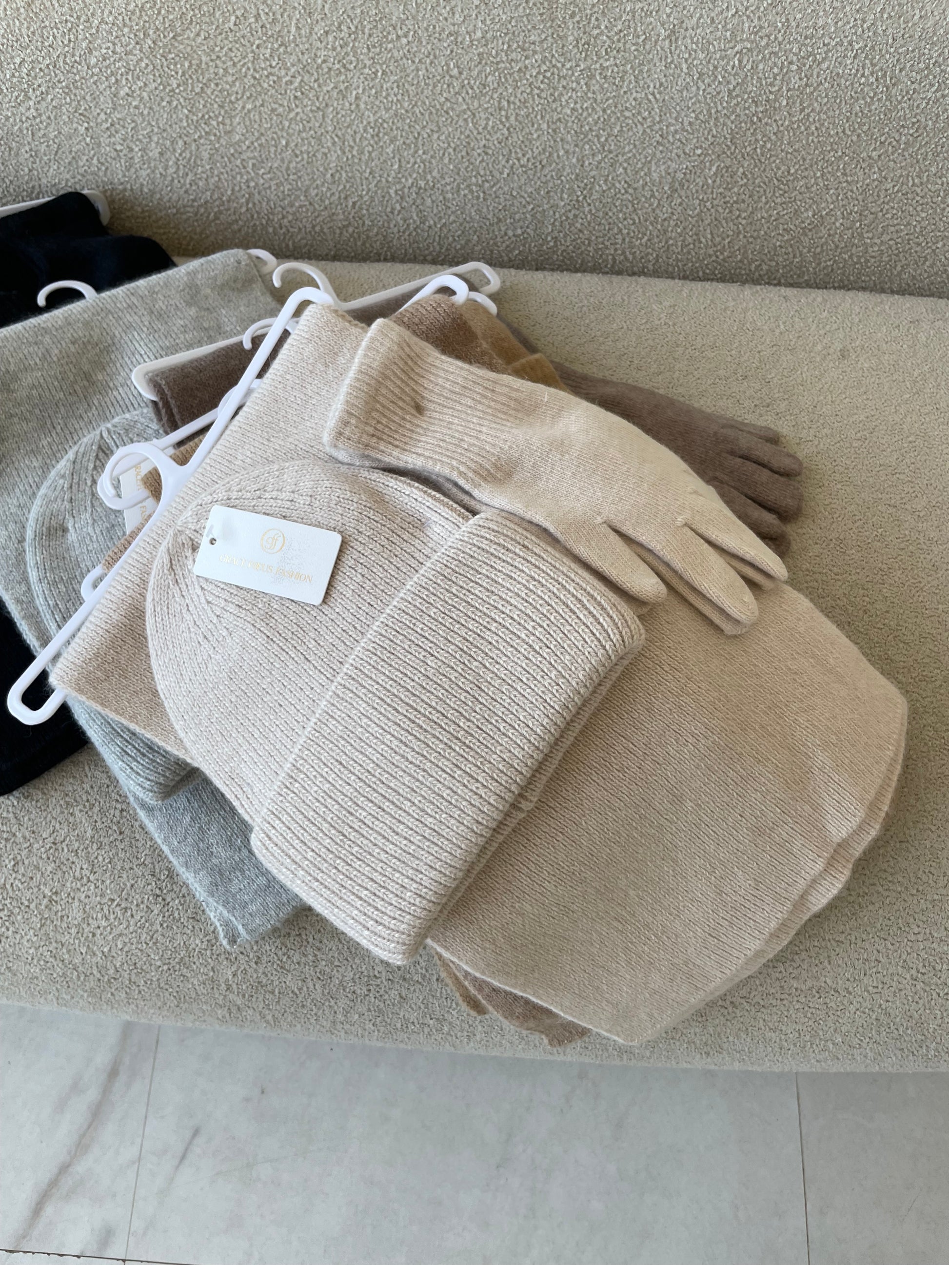 - Išmatavimai: šaliko ilgis 100cm, plotis 28cm. Kepurės aukštis 25cm, plotis 23cm. Pirštinių ilgis 27cm, plotis 11cm.