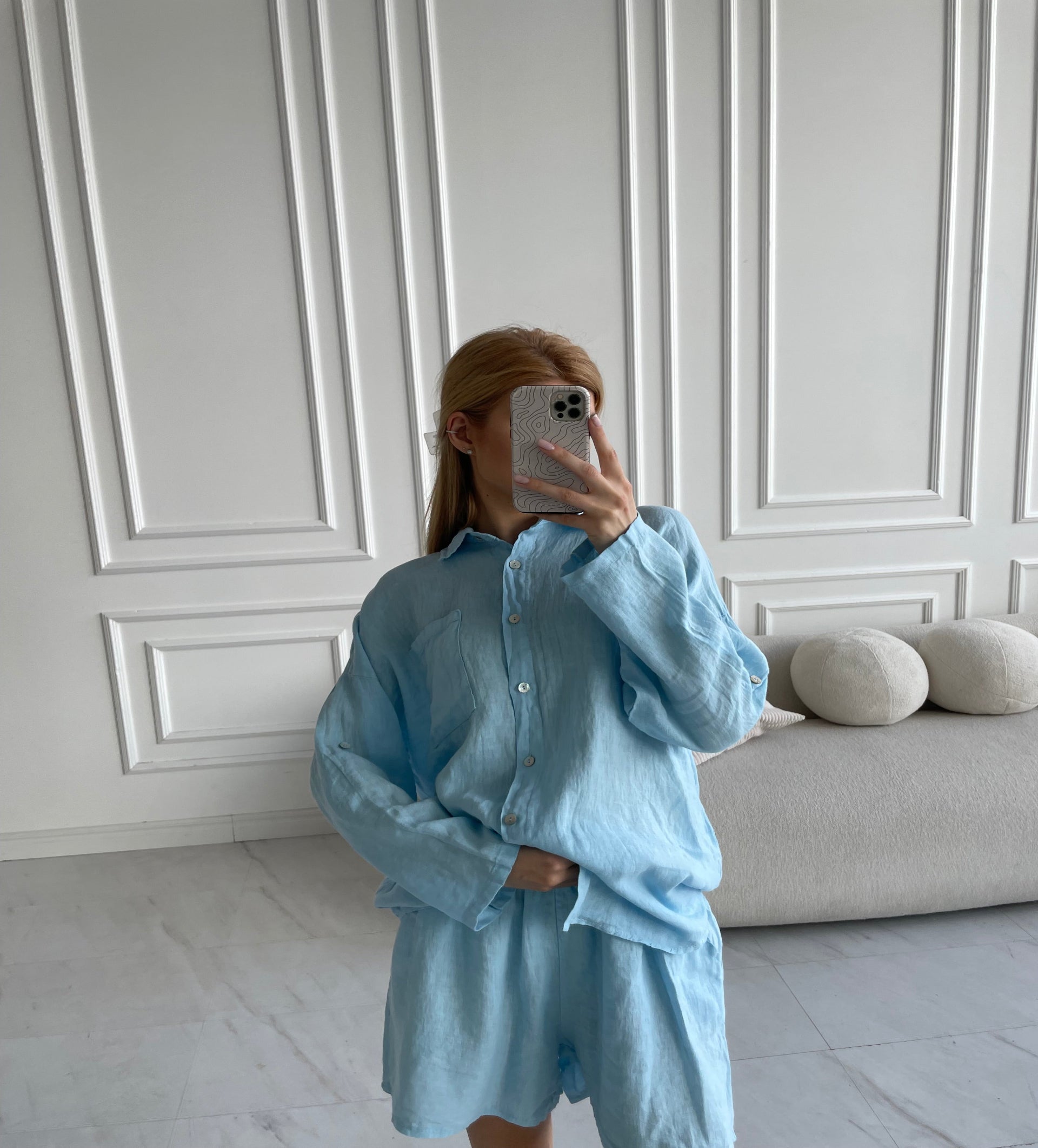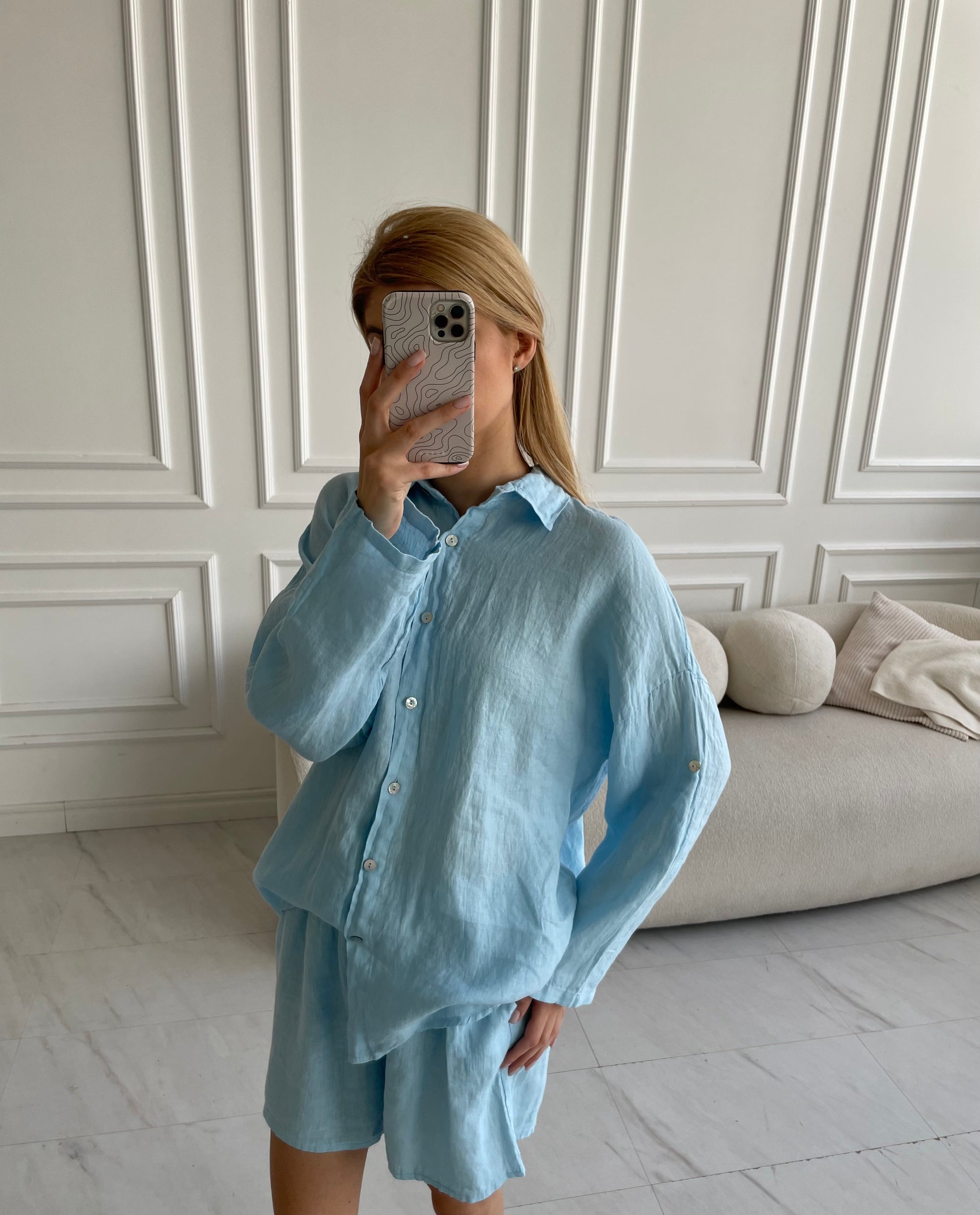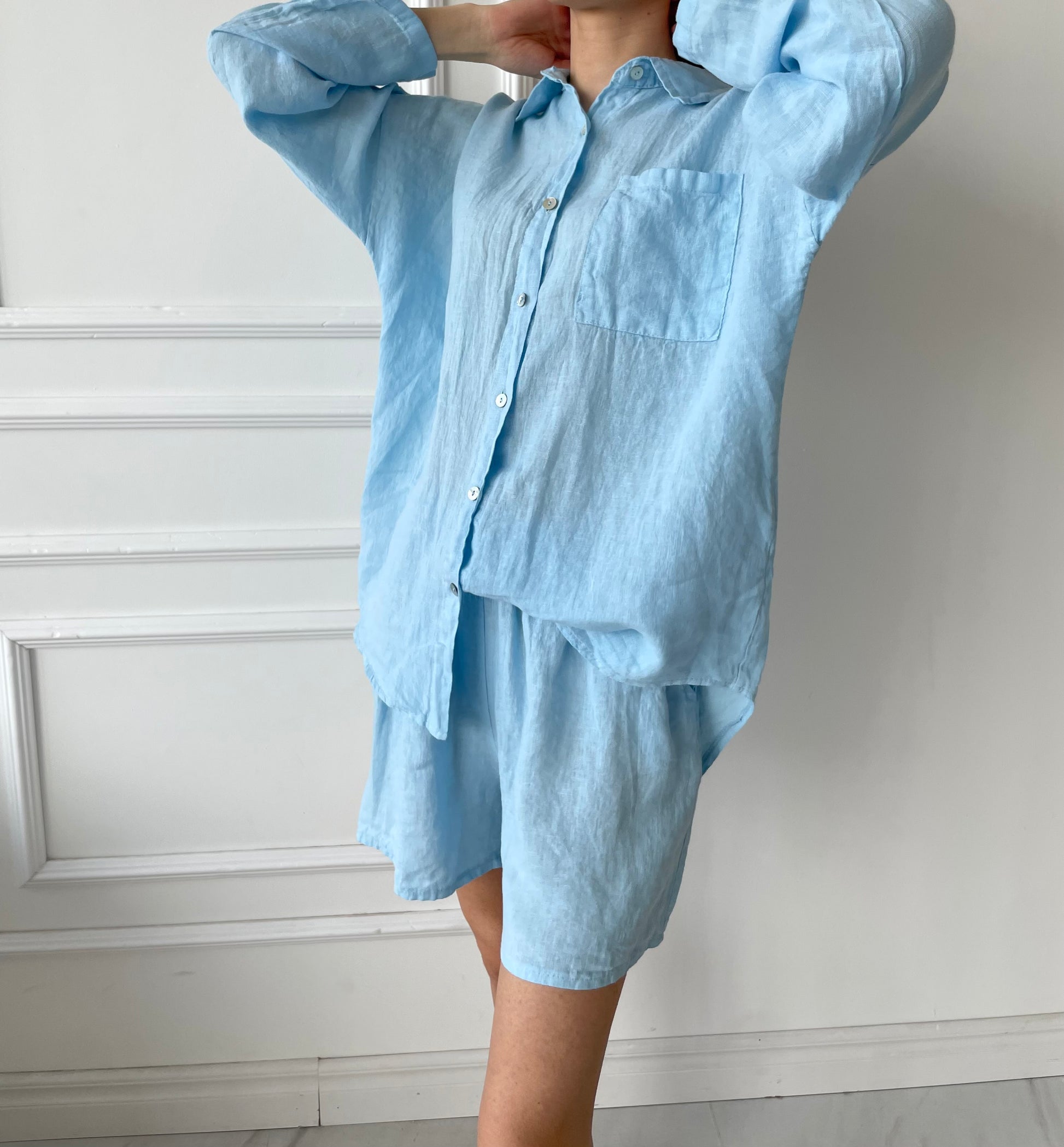 Žydras lino kostiumas su šortais